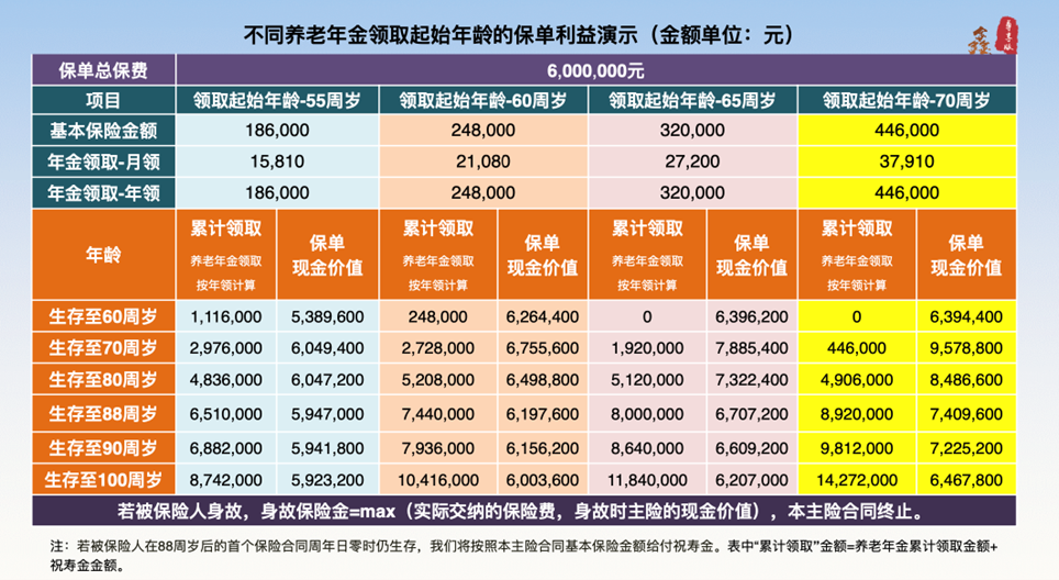 首先是方案靈活,“鑫禧年年”可提供兩種保障方案任選,方案一的鑫禧“精彩養(yǎng)老計(jì)劃”,即選擇被保險(xiǎn)人身故時(shí)按主險(xiǎn)合同的現(xiàn)金價(jià)值給付身故保險(xiǎn)金的方案,優(yōu)勢(shì)在于在合同有效期內(nèi)被保險(xiǎn)人生存期可領(lǐng)取養(yǎng)老年金、祝壽金的金額相對(duì)較多,主打提前規(guī)劃和品質(zhì)養(yǎng)老,特征是高領(lǐng)取,側(cè)重于保障自身的養(yǎng)老品質(zhì);方案二的鑫禧“傳世養(yǎng)老計(jì)劃”,即選擇本主險(xiǎn)合同實(shí)際交納的保險(xiǎn)費(fèi)與被保險(xiǎn)人身故時(shí)按本主險(xiǎn)合同的現(xiàn)金價(jià)值二者的較大者給付身故保險(xiǎn)金的方案,特點(diǎn)是相較于方案一的高現(xiàn)價(jià),主打精致養(yǎng)老和財(cái)富傳承,在領(lǐng)取養(yǎng)老年金、祝壽金獲得老年生活資金支持的同時(shí),身故后可以留給后代更多資金,側(cè)重于財(cái)富傳承。