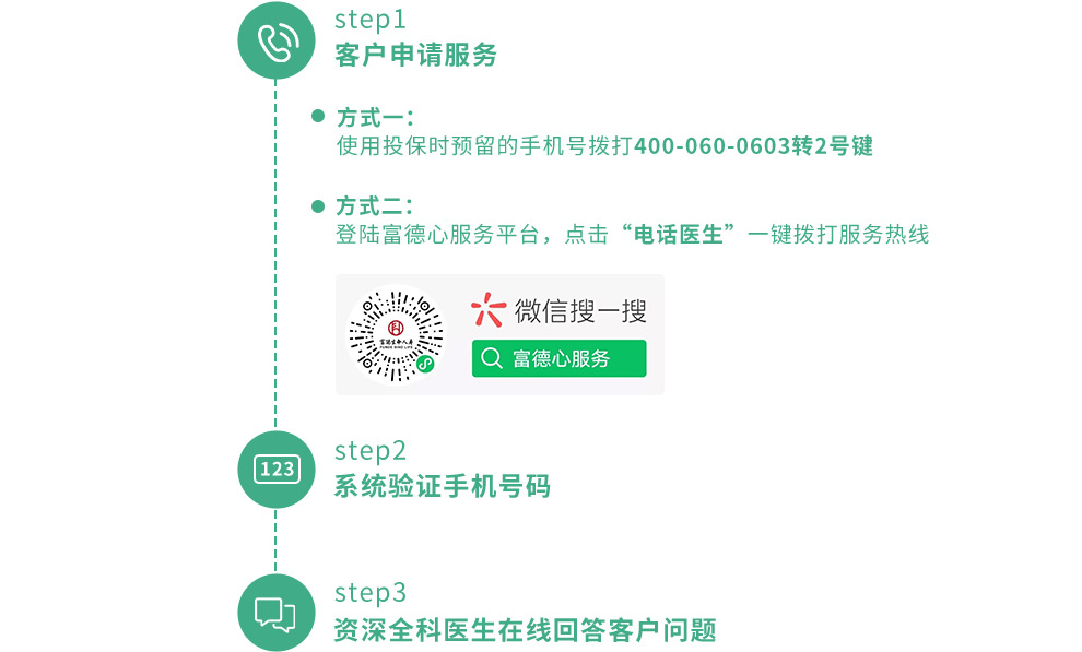 特定健康險(xiǎn)有效保單客戶在服務(wù)期限內(nèi)使用投保時(shí)預(yù)留的手機(jī)號(hào),撥打健康服務(wù)熱線400-060-0603轉(zhuǎn)2號(hào)鍵,或登陸富德心服務(wù)平臺(tái),點(diǎn)擊“電話醫(yī)生”即可一鍵撥打健康服務(wù)熱線。系統(tǒng)會(huì)自動(dòng)驗(yàn)證手機(jī)號(hào)碼,驗(yàn)證成功后,將連線持有國家衛(wèi)生部頒發(fā)的執(zhí)業(yè)醫(yī)師資格證書、且超過十年臨床經(jīng)驗(yàn)的主治醫(yī)師級(jí)別以上資質(zhì)醫(yī)生提供7*24小時(shí)不限次常見問題咨詢服務(wù),包括疾病咨詢、就醫(yī)指導(dǎo)、特殊人群指導(dǎo)、體檢報(bào)告解讀等。