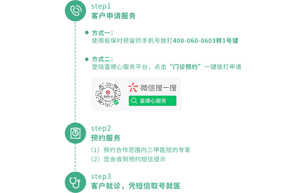 特定健康險(xiǎn)有效保單客戶可使用投保時(shí)預(yù)留的手機(jī)號(hào)撥打服務(wù)熱線,400-060-0603轉(zhuǎn)1號(hào)鍵?;虻顷懜坏滦姆?wù)平臺(tái),點(diǎn)擊“門診預(yù)約”同樣可以一鍵撥打申請(qǐng)。健康管家將根據(jù)客戶的病情、地址及醫(yī)院資源情況幫客戶預(yù)約合作范圍內(nèi)三甲醫(yī)院的專家,預(yù)約成功后將發(fā)送預(yù)約短信至客戶,客戶憑短信即可到醫(yī)院取號(hào)就醫(yī)。