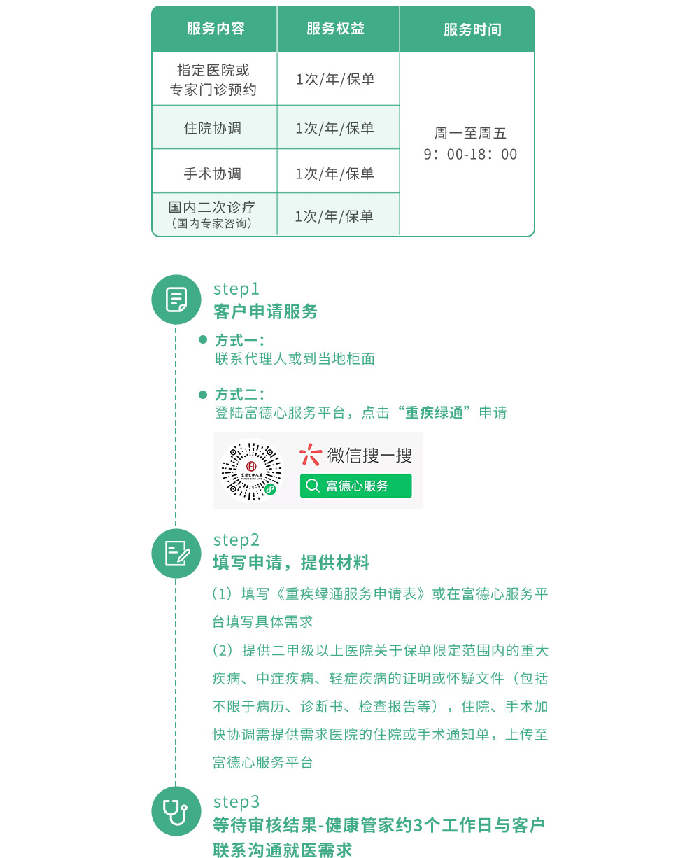 為符合一定服務(wù)條件的特定健康險(xiǎn)客戶提供集電話醫(yī)生、門診預(yù)約、住院協(xié)調(diào)、手術(shù)協(xié)調(diào)、國內(nèi)二次診療(國內(nèi)專家咨詢)五項(xiàng)就醫(yī)服務(wù),其中指定醫(yī)院及專家門診預(yù)約、住院協(xié)調(diào)、手術(shù)協(xié)調(diào)、國內(nèi)二次診療(國內(nèi)專家咨詢)四項(xiàng)服務(wù)為重疾綠通服務(wù)。持特定健康險(xiǎn)有效保單客戶可在服務(wù)權(quán)益及期限內(nèi)免費(fèi)使用,專屬綠通服務(wù),幫助客戶解決就醫(yī)后顧之優(yōu)。